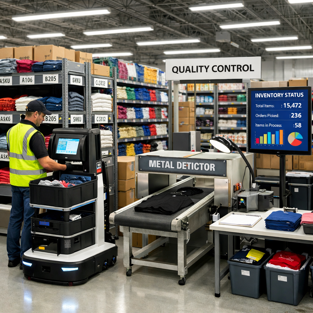 ①SKU爆発:1商品が20〜100種類の在庫ラインに分裂する。②検針・畳み直し:出荷前の金属探知と整形が必須工程になる。③高い返品率:サイズ・イメージ違いによる返品率が10〜30%に達するケースも。④繁忙期の波動:セールや新作発売で1日の出荷量が通常の3〜10倍に跳ね上がる。